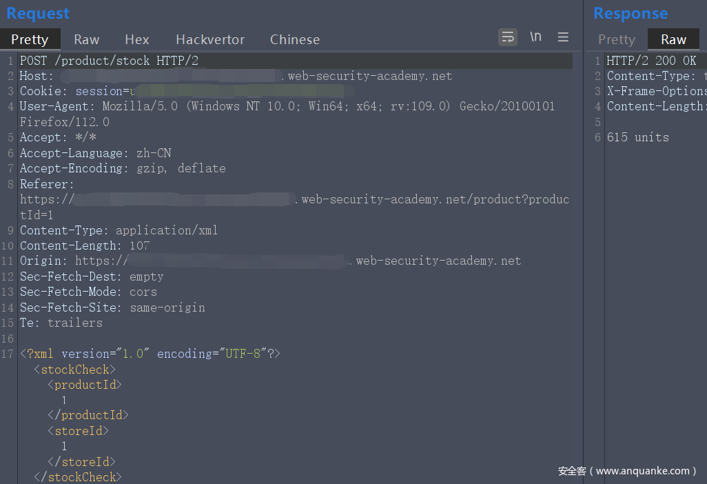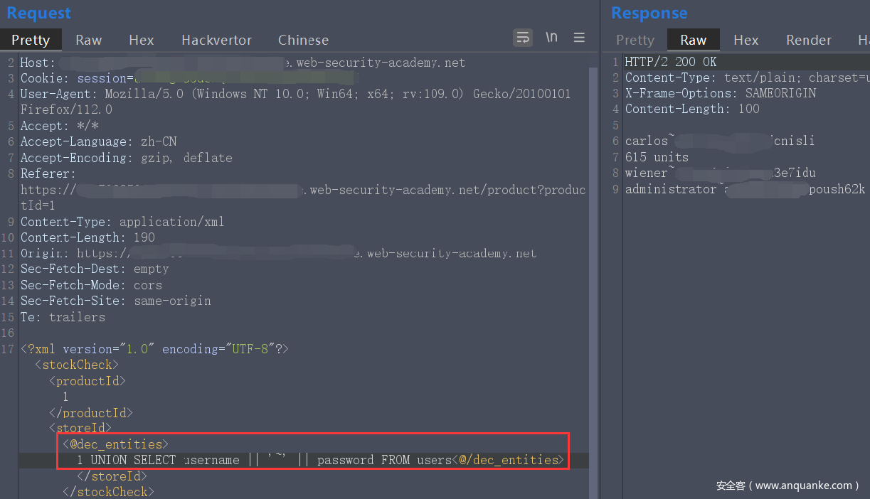 题目介绍说检查库存功能存在sql注入漏洞,查询结果会在响应包中回显,所以我们可以使用Union注入来获取数据,然后我们的目标是读取到users表中的账号密码,成功登录就算解题成功。