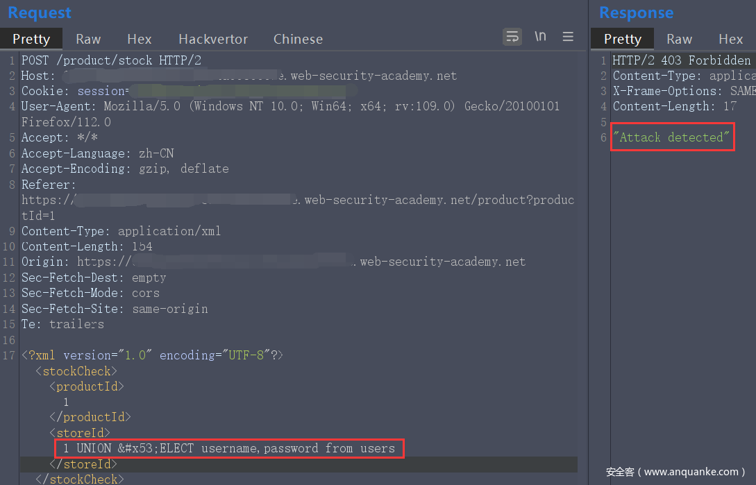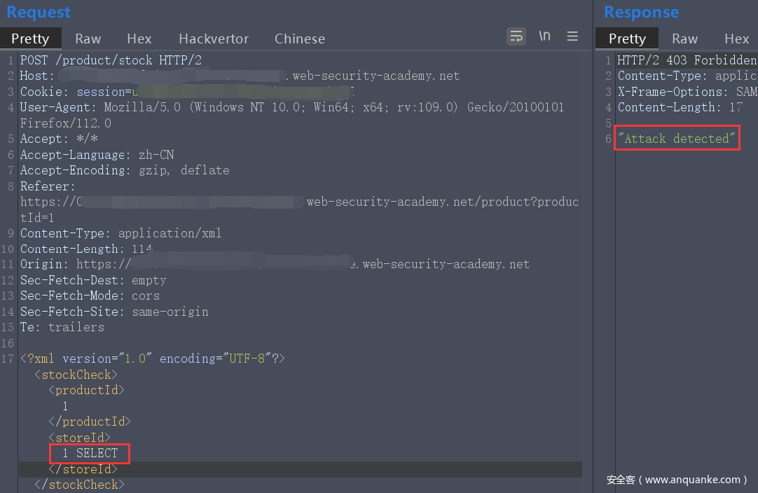 诶?邪门儿了,怎么还是拦啊,看来不止过滤了SELECT关键字,这里我们就需要借助Hackvertor插件来进行整体的一个XML编码了,看看效果