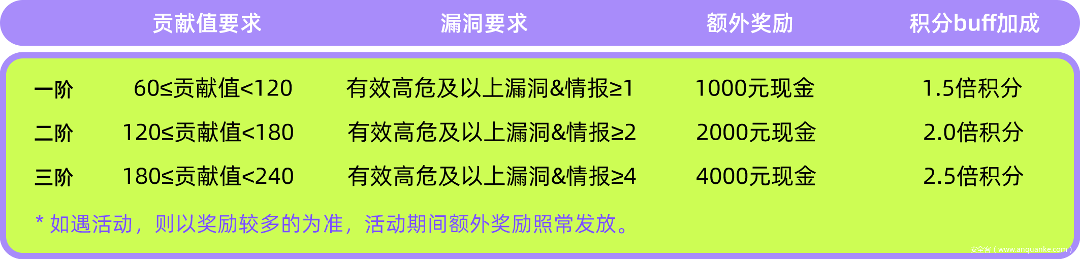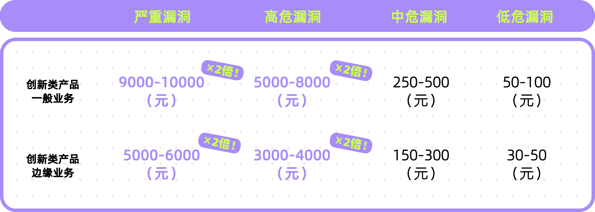锵锵锵然后就是咱们本次的活动啦!5.5-5.21期间,创新类产品全线业务高危/严重有效漏洞&情报双倍积分加成,单个漏洞&情报最高奖励可达10000元!详细可见下表: