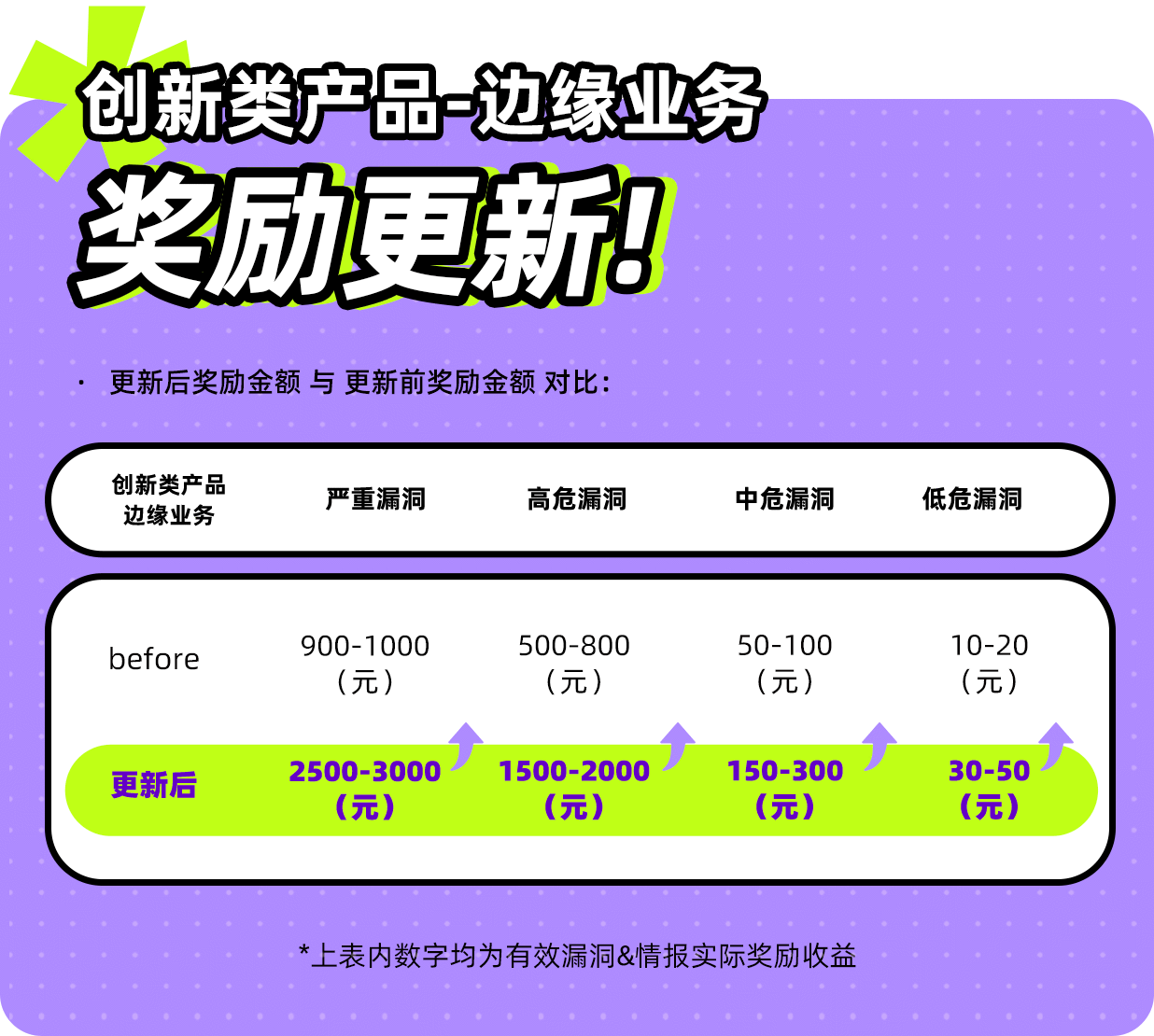5.4日我们对创新类产品-边缘业务的漏洞奖励进行了调整,奖励金额大幅上涨,这也是我们SRC成立以来的首次奖励基数调整:
