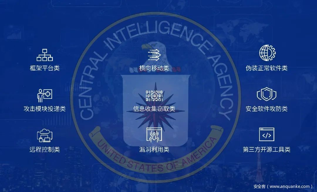 报告显示,CIA在针对全球发起的网络攻击行动中,大量使用“零日”漏洞,其中包括一大批至今未被公开披露的后门和漏洞,在世界各地建立“僵尸”网络和攻击跳板网络,针对网络服务器、网络终端、交换机和路由器,以及数量众多的工业控制设备分阶段实施攻击入侵行动。其使用的攻击武器主要分为9个类别,包括攻击模块投递类、远程控制类、信息收集窃取类、第三方开源工具类等。
