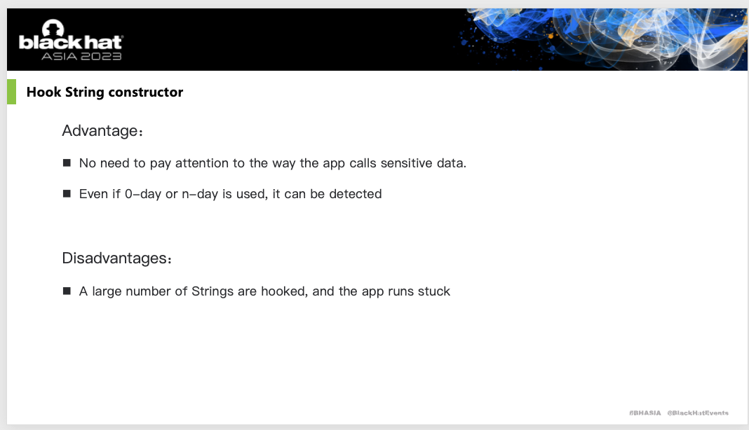 同时,几乎所有的敏感信息在传递到应用程序之前都会被编码成一个字符串。在这个背景下,无恒实验室自研了一种相对简单的检测方法来解决隐私泄露的问题,即通过Hook String的构造函数方式,便可以检查在移动设备上构造的所有字符串,这种策略看似简单但是很全面,因为无论恶意应用程序以任何方式获取敏感数据字符串,都可以监控到。