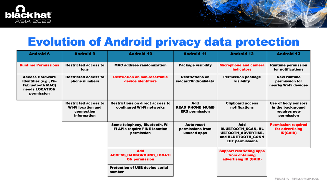 Google从Android 6 开始增加对隐私保护的建设,如增加运行时权限,当需要获取设备唯一标识、位置信息、相机等数据时均需要拿到运行时权限。在Android 10时继续加大隐私保护力度,如限制应用获取IMEI等设备唯一标识符。Android 12开始,用户可以设置限制追踪禁止APP获取GAID (谷歌广告ID)。同时,无恒实验室也注意到,对于iOS系统来说,从iOS 14.5开始,APP想要获取 IDFA,也需要用户手动授权。
