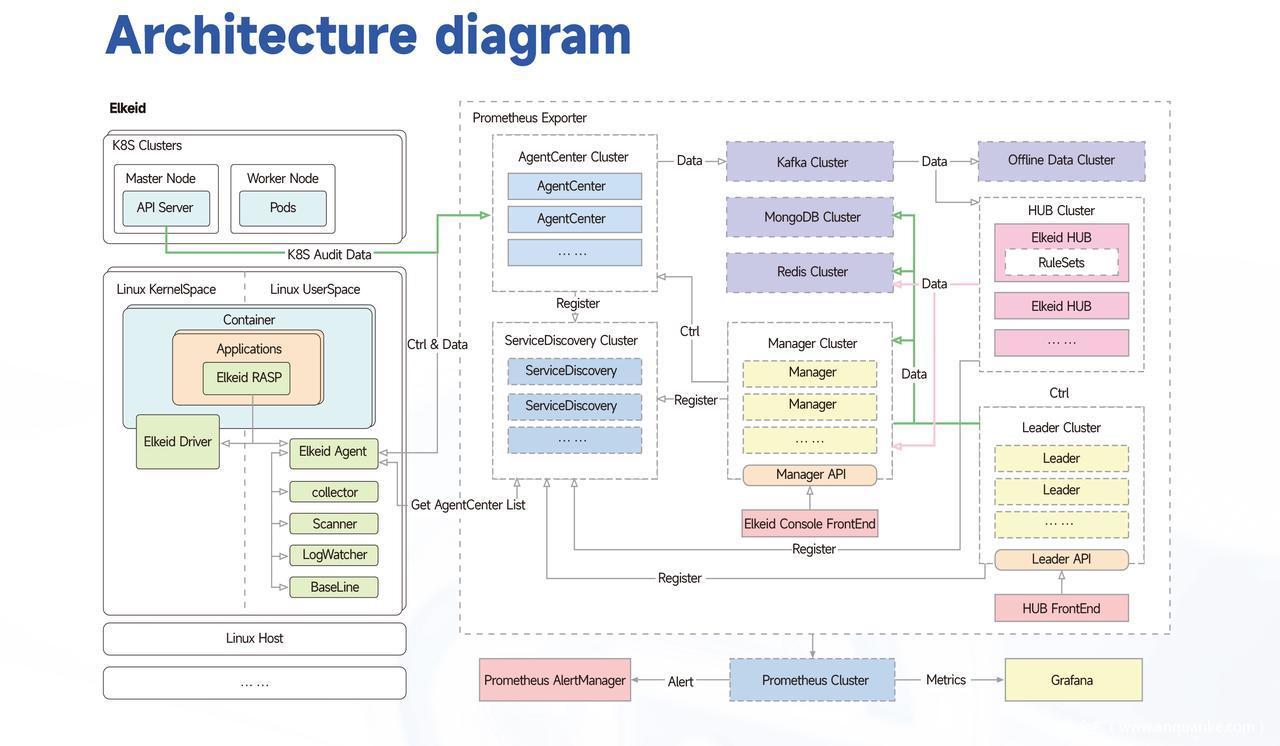 - · Elkeid 在用户态支持多维度的资产采集、日志采集、恶意文件识别、风险发现等功能。