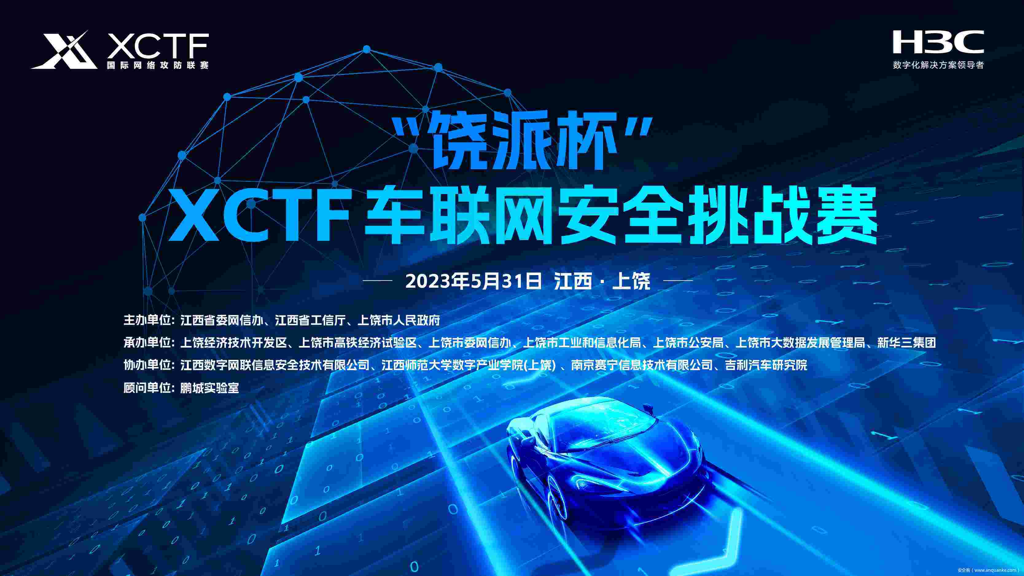 为深入贯彻落实国家网络强国和交通强国战略部署,推动智能网联汽车技术与产业发展、加快该领域人才培养、提升行业创新,打造自主可控、自主研发的中国智能网联汽车安全生态体系,由江西省委网信办、江西省工信厅、上饶市人民政府主办,上饶经济技术开发区、上饶市高铁经济试验区、上饶市委网信办、上饶市工业和信息化局、上饶市公安局、上饶市大数据发展管理局、新华三集团承办,江西数字网联信息安全技术有限公司、江西师范大学数字产业学院(上饶)、南京赛宁信息技术有限公司、吉利汽车研究院协办,由鹏城实验室任顾问单位的“饶派杯”XCTF车联网安全挑战赛将在5月31日于江西省上饶市正式开启。