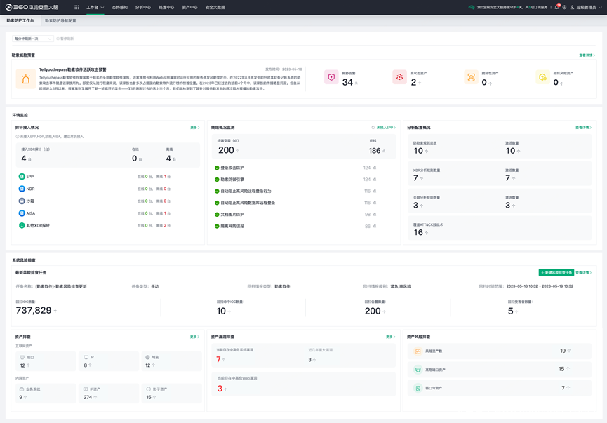 联动360资漏一体化平台,摸清家底、识别重要资产,全面排查并处置系统风险,提供系统抗勒索攻击能力。
