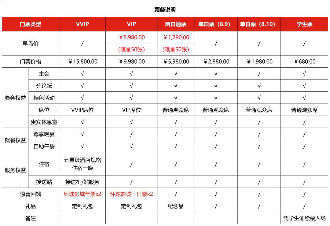 本届大会设有六类门票,分别为学生票、单日票(8.9)、单日票(8.10)、两日通票、VIP贵宾票、VVIP贵宾票,价格从680到15800不等。