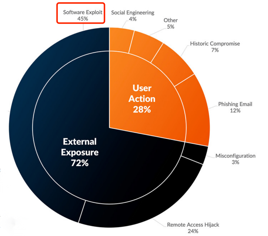 北极狼实验室发布的《北极狼实验室2023年威胁报告》中指出,在2022年,45%的网络安全事件是由漏洞引起的,这些漏洞本可以通过事件发生之前的安全补丁和更新得到缓解。在这些事件中,攻击者利用一个已知的漏洞(例如,代理Shell、Log4Shell)来获得对网络的访问权。
