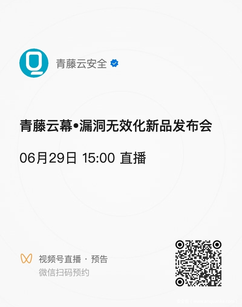 6月29日,青藤将举办“青藤云幕 · 漏洞无效化新品发布会”,一键点击预约,更多精彩内容期待与您一起见证!