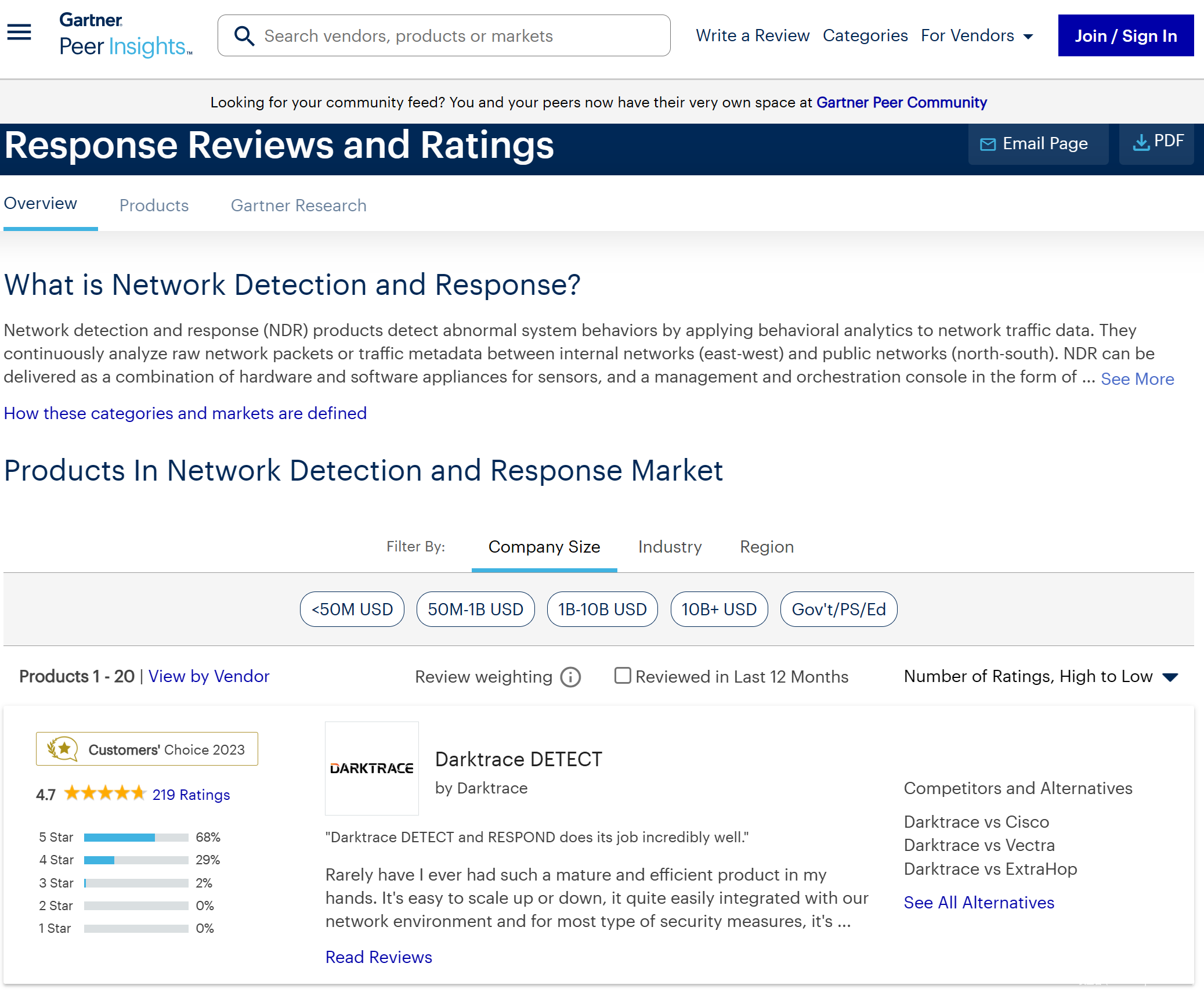 据最新官方介绍,Gartner Peer insights平台涵盖了550个IT软件及服务市场,涉及2.15万种产品,经过验证的评价与评级达到55万条,均为一线用户最真实的声音,能够帮助甲方企业做出更明智的决策。