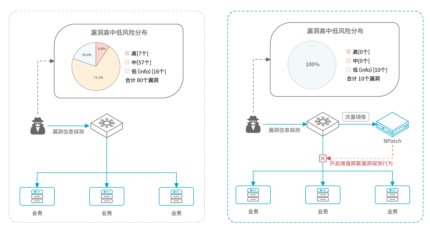 减少漏洞利用机会:对漏洞防探测、防攻击、防扩散,降低漏洞利用风险。