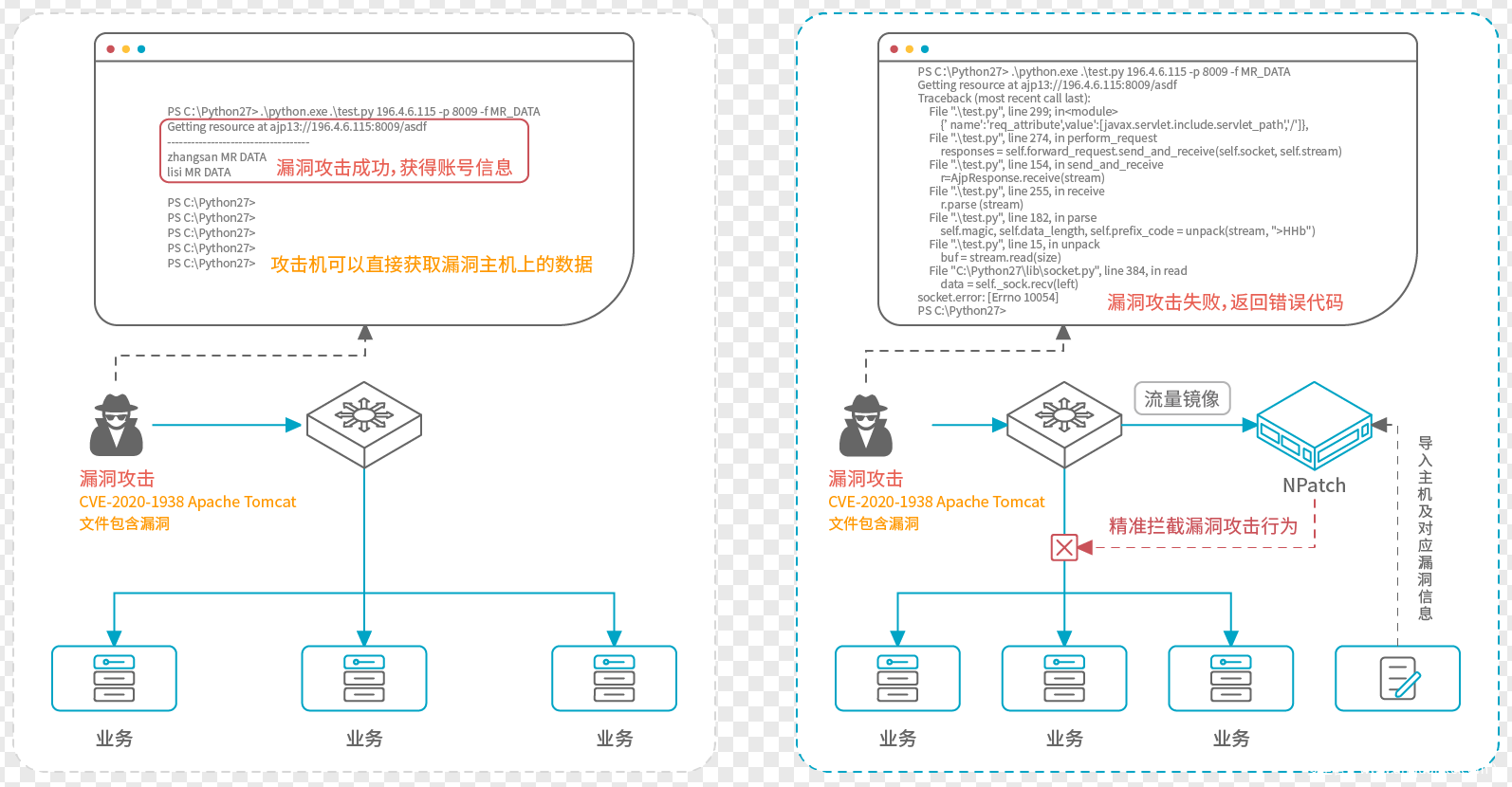 针对漏洞问题,除了升级官方补丁外,当前主流的方案是主机虚拟补丁。但该产品无法防护漏洞探测行为,且在架构上会对现有业务系统造成影响,主要表现在以下两方面: