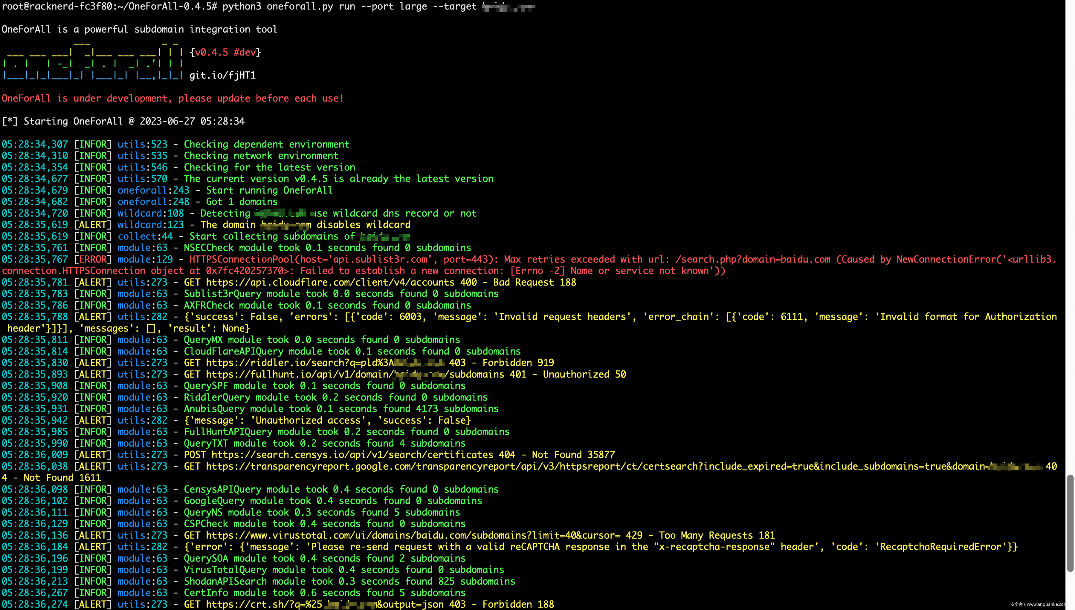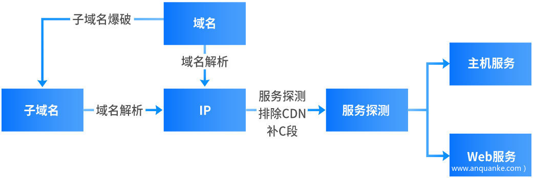 1.针对域名,利用域名爆破、oneforall等手段获取域名,若为oneforall,则可获取更多IP地址,加入IP资产表。