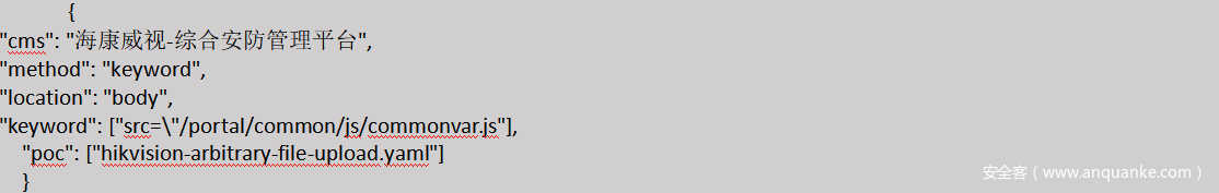 指纹库规则可参考Finger,将指纹对应的POC关联起来形成内部漏洞指纹库,如: