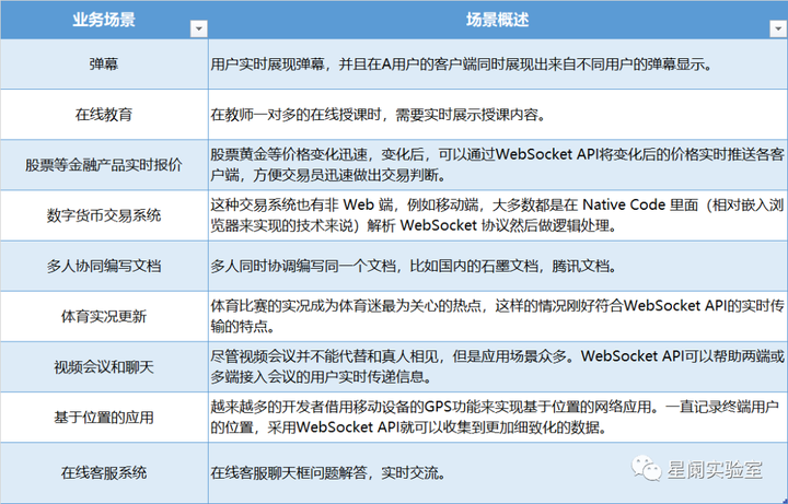 - 实时数据更新的应用程序:对于一些需要服务端不断发送数据在客户端实时显示的应用,使用WebSocket API作为数据传输接口无疑是最好的选择。