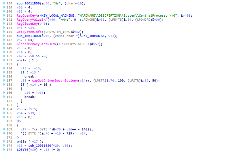 而到了具体的功能部分,该木马首先会获取用户机器的基本信息信息——这其中包括操作系统信息、CPU信息、内存信息等,并把获取的这些信息经过加密后发送到远程机器上。