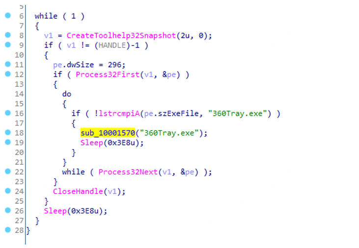 连接成功后,木马会尝试接收从该服务器中下放的payload内容并进行加载执行。执行后的payload会在内存中解密出一个dll文件——该dll则是一个具有完整功能的远控木马。而有趣的是,在该dll运行时,其代码会检测360Tray.exe进程是否存在——如果存在,则会弹一个应用程序错误的窗口,用于迷惑用户。