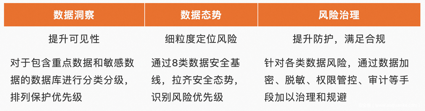 阿里云数据安全中心DSPM能力,从GB/T 37988-2019《信息安全技术数据安全能力成熟度模型》为依据,定义了8种常见的数据风险场景,并通过统一的控制台进行报警,降低企业运维复杂度。
