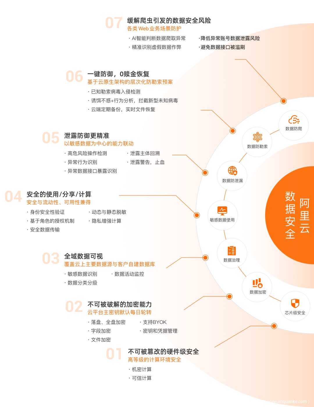 数据安全是云上客户最为关注的问题之一,数据在产生、存储、交换、销毁等流程中面临着不同的风险,并非单点技术可解决,而是需要自上而下的体系化建设,阿里云从物理机房、IaaS、PaaS、SaaS层为客户提供7大数据防护能力,涉及数十项能力点。未来,阿里云也将持续致力于为客户数据提供安全的环境和保护能力,保护客户数据安全。