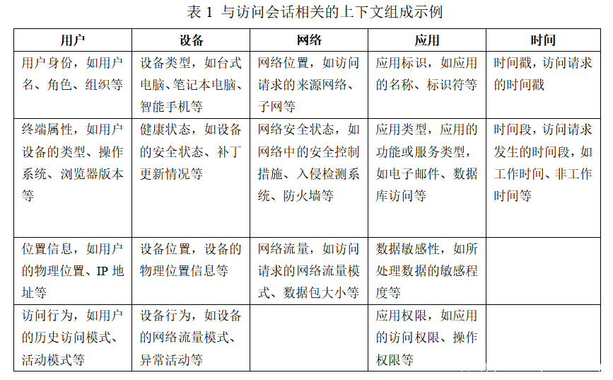 在零信任(Zero Trust)中,上下文指的是访问请求发生时的环境和相关信息。这些上下文信息可以包括用户身份、设备属性、网络位置、应用、时间、行为模式等(如表1)。通过分析和综合这些上下文信息,可以更好地评估访问请求的风险程度,并做出相应的访问决策。这种基于上下文的访问控制可以根据实际情况对每个访问请求进行细粒度的评估,并采取适当的安全措施,以确保安全访问。