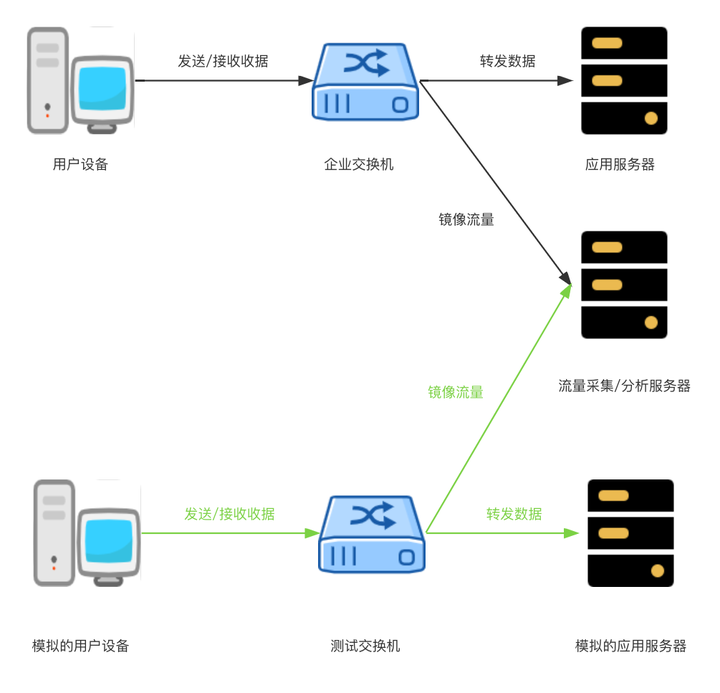 在上述架构中,交换机通过流量镜像的方式,将用户与应用服务器之间的流量“复制”给流量采集/分析服务器。流量服务器上部署的采集探针负责协议数据包的重组,以及一部分流量分析工作,比如判断数据包是否触发某些规则。此时,需要对流量采集探针进行两方面的测试工作: