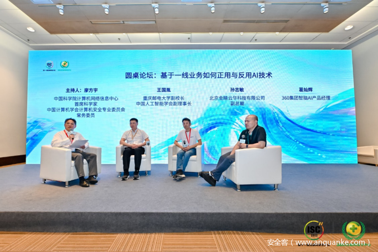 随后的圆桌论坛上,中国科学院计算机网络信息中心首席科学家、中国计算机学会计算机安全专业委员会常务委员廖方宇作为主持人,与重庆邮电大学副校长、中国人工智能学会副理事长王国胤,北京金睛云华科技有限公司副总裁孙志敏,360集团智脑AI产品经理葛灿辉就“基于一线业务如何正用与反用AI技术”展开讨论。