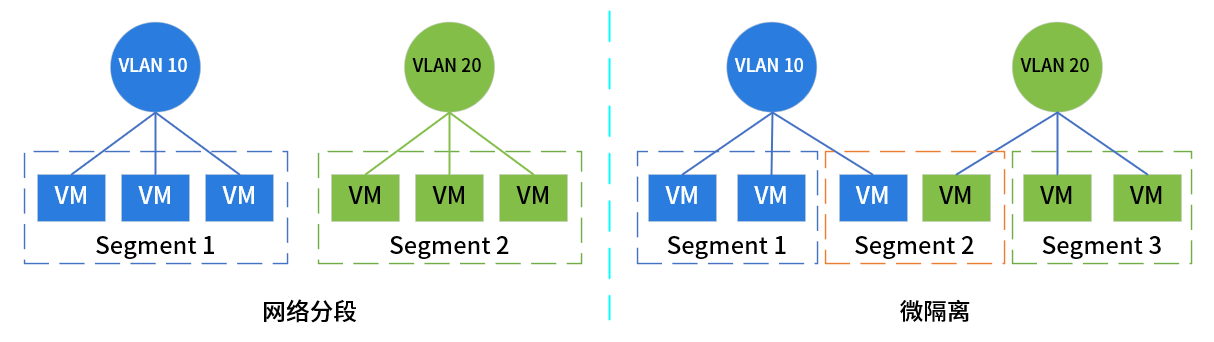 微隔离(Micro-Segmentation)对网络分段进行进一步细化,力图将每个设备(甚至应用程序)置于独立的分段内。与被称为宏隔离(Macro-Segmentation)的网络分段相比,微隔离虽然确实将网络划分为更小的隔离部分,但其重点是要能够为单个工作负载、应用程序或服务创建安全策略,提供比网络分段更细粒度的可见性和安全控制,确保所有设备或应用程序之间的流量都被检查,以查找潜在的恶意内容或违反企业安全或访问控制策略的行为。