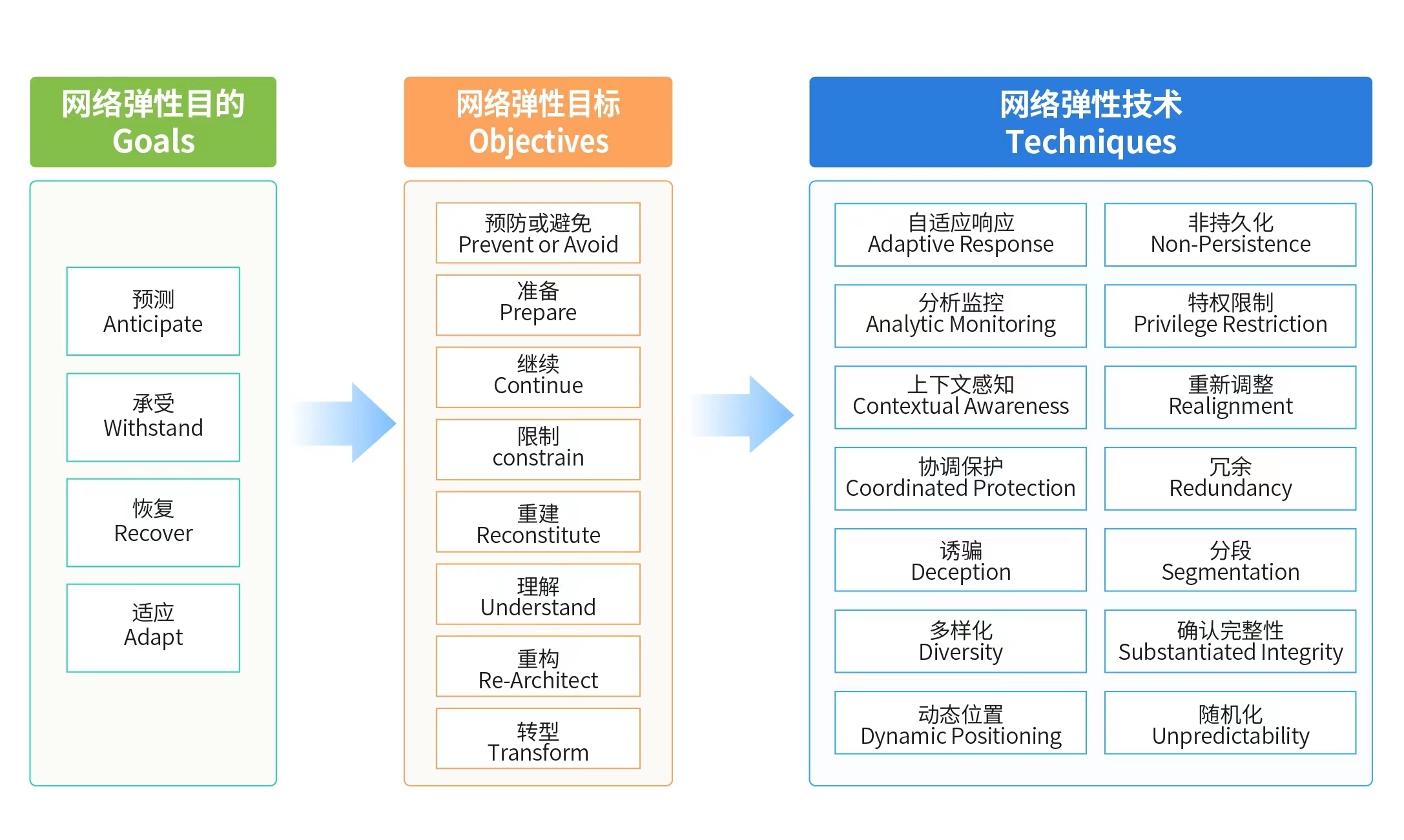 从实现层面看,网络弹性更侧重对关键业务和核心基础设施的安全保障,并通过网络弹性工程框架(CREF,如图3)从目的、目标和技术三个层面给出了网络弹性的实现框架。