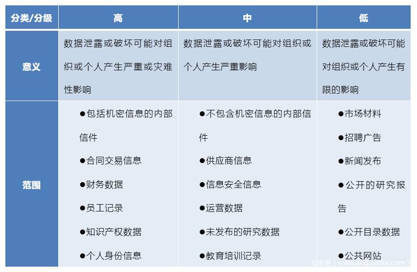 数据分类是根据数据的类型、敏感性和业务价值对数据进行标记的过程,以便可以在组织内部和外部就如何管理、保护和共享数据做出策略选择。通常,大多数组织需要采用自定义的分类(例如表1)和粒度,以匹配其数据安全解决方案的分类保护和控制能力。