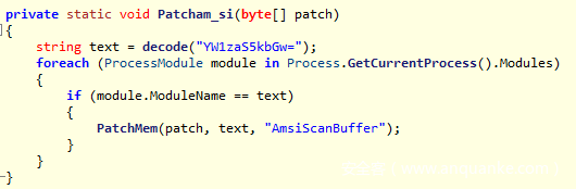 我们对攻击载荷进行解密后发现,该代码是一个用.NET编写的远控木马,并带有一系列与安全软件对抗的功能。例如:木马会判断用户机器是否处于虚拟机之中,以及对Windows反恶意软件接口(AMSI)的AmsiScanBuffer函数进行了patch