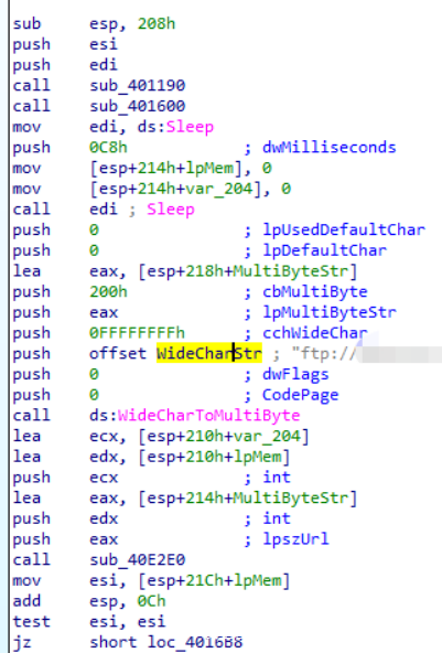 该木马自身具有远程加载执行功能。木马启动后,会通过FTP协议远程加载网络侧的攻击载荷并执行。