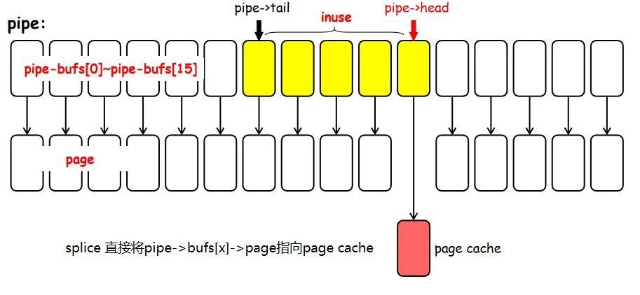 splice系统调用将目标文件的一字节写入管道,此时管道中的某buf的page挂的就是page_cache,并且flags保留了prepare pipe操作中的标志,此时带有PIPE_BUF_FLAG_CAN_MERGE - 2、然后就可以往