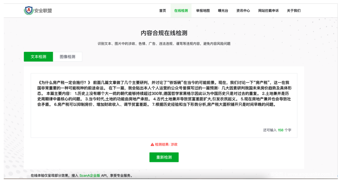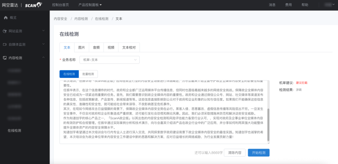 无论是网络文章、社交媒体内容还是公司内部文件,都可以通过ScanA进行全面检测,实时预警可能存在的风险。