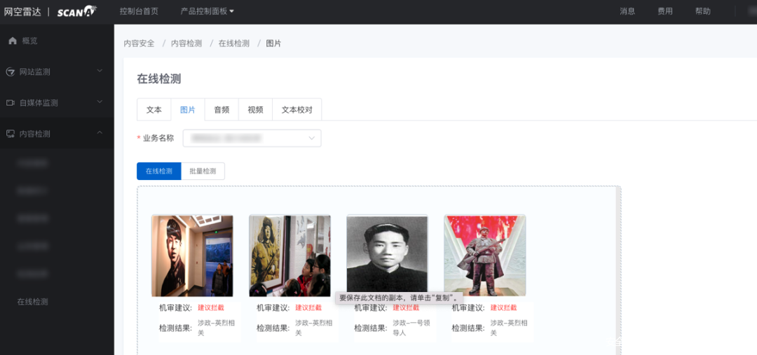 ScanA内容安全在线检测是一款基于人工智能技术的在线检测工具,通过对文本、图片、音频、视频、文本校对等多种类型内容进行深度分析和识别,快速发现潜在的内容安全风险:
