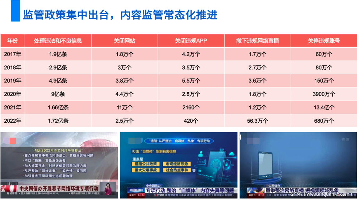 近年,监管单位对互联网环境的整治行动层层迭进,加大了对互联网违法违规内容的打击力度,加强了对各大互联网平台以及自媒体的监管,在此过程中互联网内容安全相关法律法规和制度也得到进一步完善。