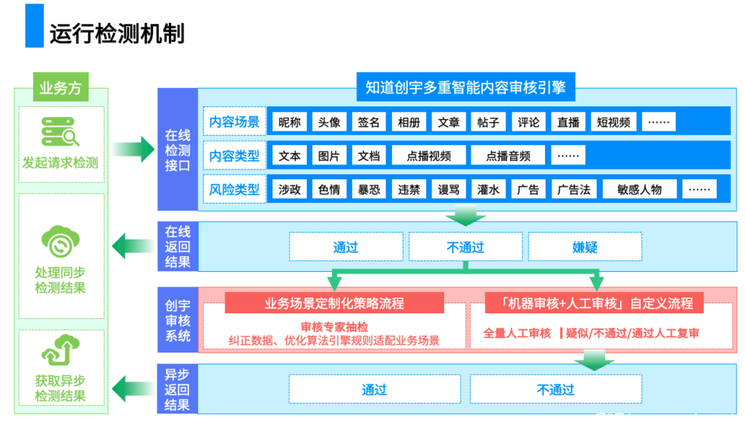 ScanA企业版为互联网内容平台提供高准确率的内容安全智能一体化方案。通过将待审图文音视等内容以API或离线等方式进行传输,针对各阶段的内容风控场景,实现对历史内容全面清查以及对新增违规内容快速拦截。