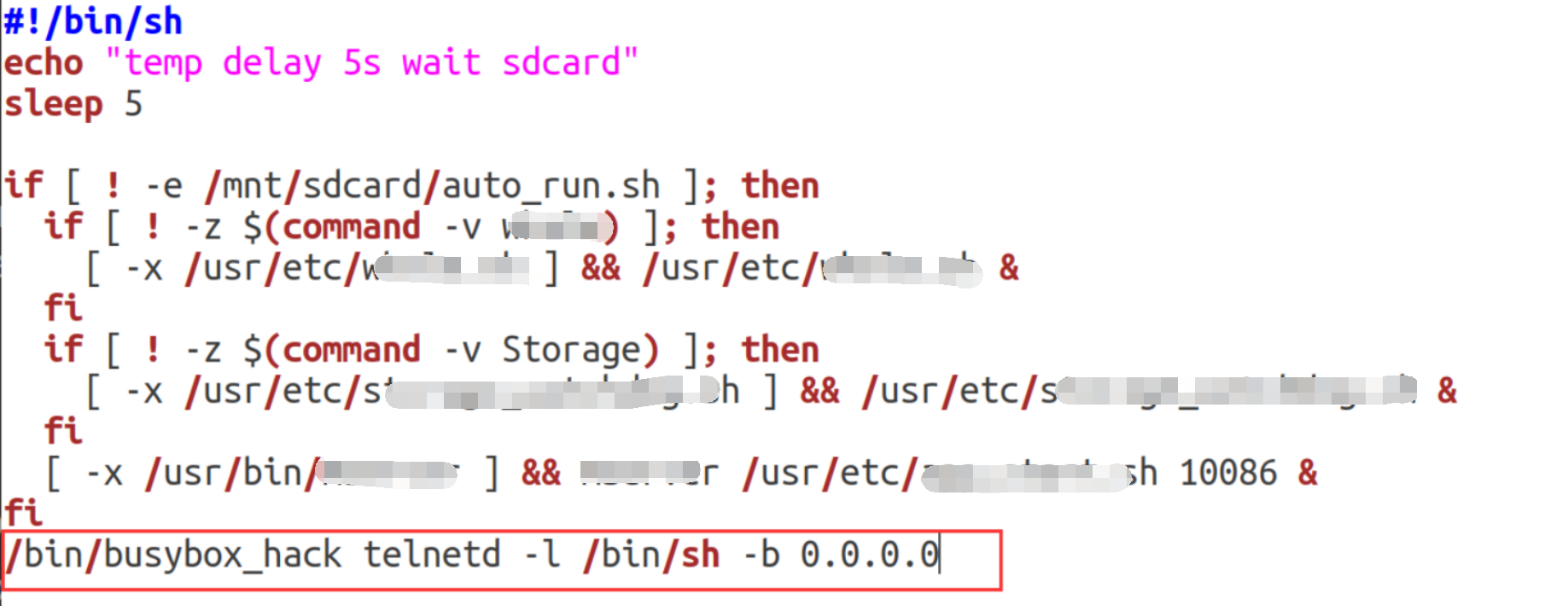 生成的busybox移植到摄像头文件系统即可。将编译的busybox复制到固件文件系统/bin目录并命名为busybox_hack。这里解包固件时记得要用root权限,因为摄像头是root用户,busybox_hack拷贝到摄像头文件系统中时也要注意修改文件的所属用户和组和其他文件一致。