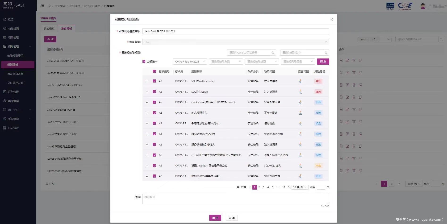 推荐模版包含最常见的CWE缺陷,方便用户快速使用;