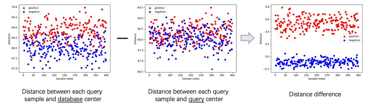 在第一个方案中,我们分析了基因数据的特点:发现当一条待查询的基因数据在数据库中存在亲属时,它更有可能与数据库样本维度的中心点有较大的距离。进一步讲,如果将基因数据与数据库中心、待查询数据集中心的距离相减,这种距离差异可以更清晰地划分有、无亲属关系的查询样本。