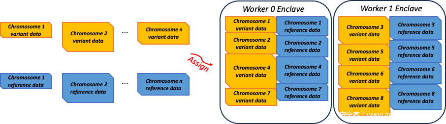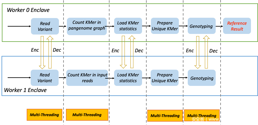 由于任务是分配到2个节点上执行,该过程中需要对统计信息(Read Variant、Load KMer Statistics)、计算结果(Genotyping)进行同步,我们对所有的通信数据进行加密以保证数据安全。