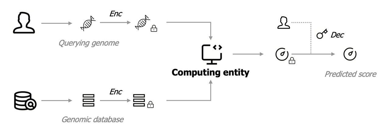 同态加密赛题设定的场景是:法医鉴定时,检查机构使用嫌犯基因、向数据机构的基因数据库去查询是否存在嫌疑人的亲属,从而快速定位嫌疑人身份。赛题要求检查机构和数据机构的基因数据都需要使用同态加密技术保护,数据经过加密后会交由一个第三方计算机构进行密文预测,最后得到的密文结果可以被检查机构解密作为判断亲属关系的依据。