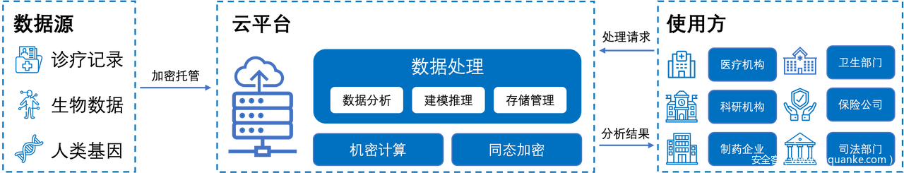 在生物信息领域,一方面对个人数据的隐私保护至关重要,另一方面医疗单位和研究机构又迫切需要打通各方数据。因此,隐私计算已逐渐成为该领域的关键技术,促进多方共同参与、合规挖掘利用数据的宝贵价值:来自不同数据源的生信数据经过加密处理后,存储在具备隐私计算能力的云平台上,进而为泛在数据使用提供所需服务。例如,隐私计算能够帮助医疗、保险机构利用个体基因数据有效地预测潜在疾病风险,从而作出综合评判。研究人员也可以通过隐私计算挖掘数据多维度价值,建立精准模型辅助诊疗、加速新药物研发等,推动生物信息领域的研究和应用创新。