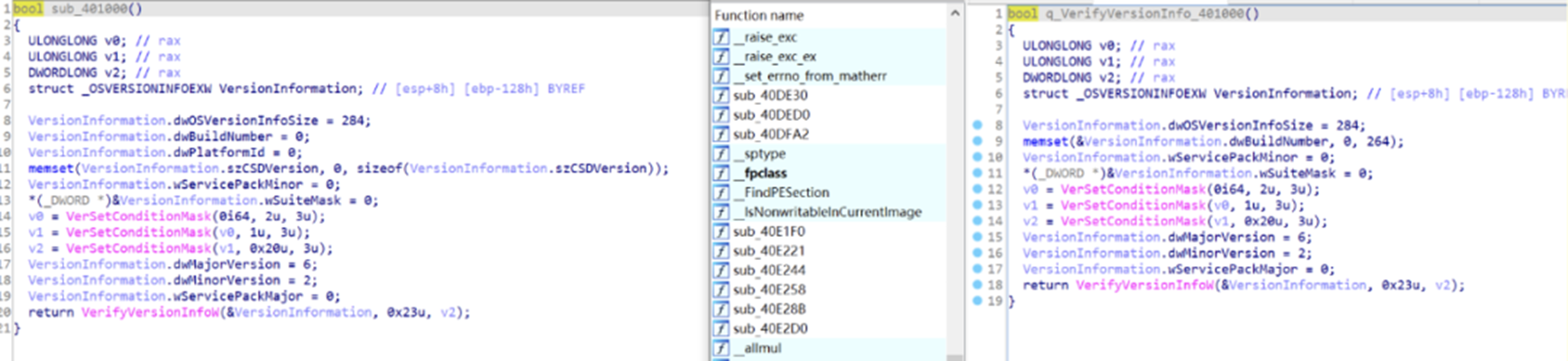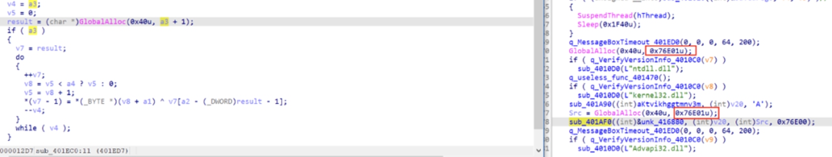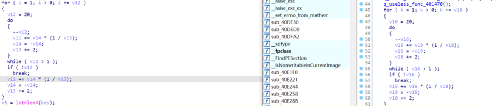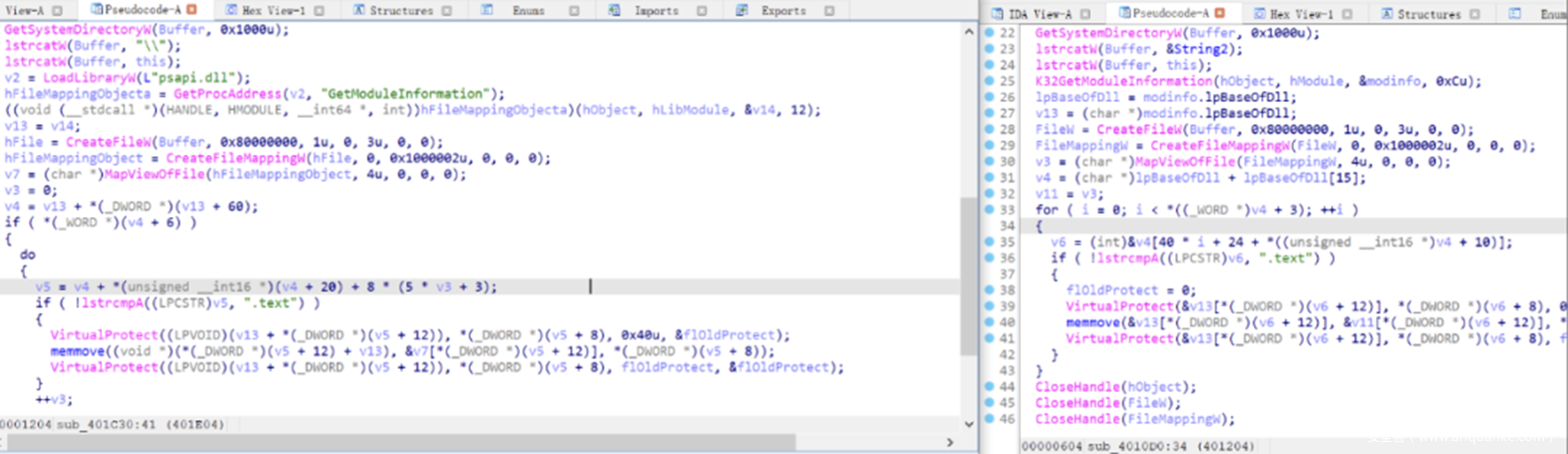 之后,我们对比了我们捕获到的remcosRAT的加载器dr.exe样本(分析见“攻击样本分析”部分)和友商报告中给出的remcosRAT [2]。发现他们之间有一定的相似性,如下(左边为友商报告中的样本,右边为这次我们捕获到的样本)。