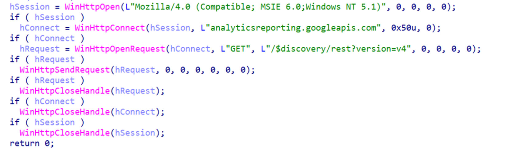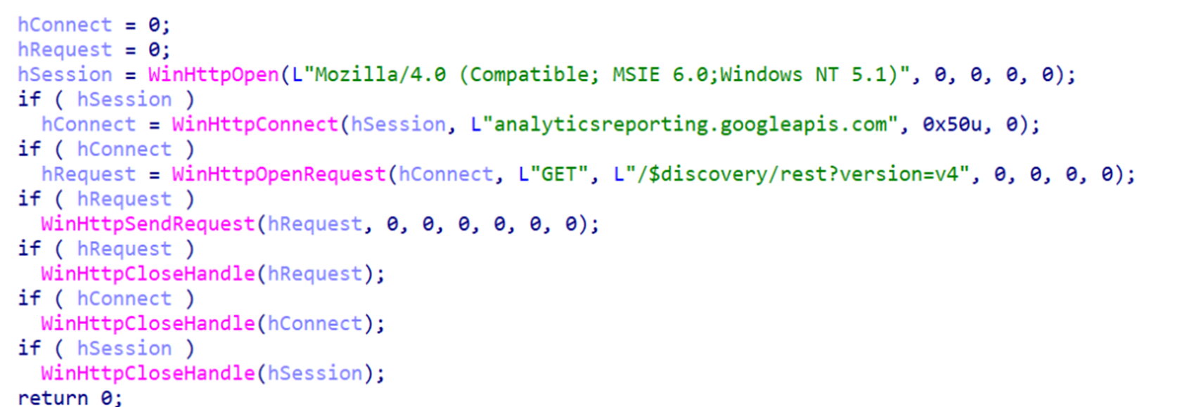另外,在该样本执行过程中会访问analyticsreporting.googleapis.com:80,URI为/$discovery/rest?version=v4, 此页面为Google分析报告服务,在该样本中没有用到该服务。