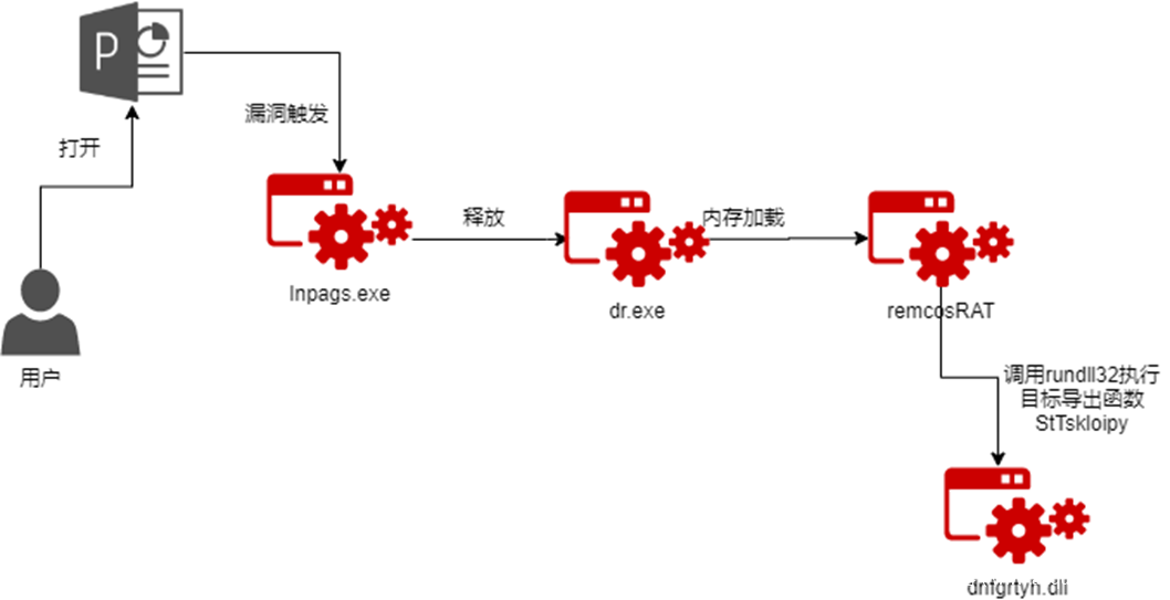 在行为侧上,我们发现当受害者打开inp文档后, remcosRAT被加载,并且调用了rundll32执行dnfgrtyh.dll的导出函数StTskloipy。