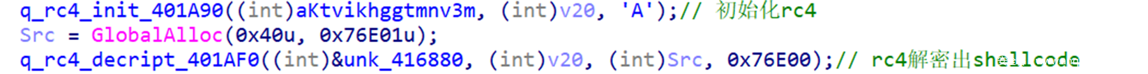 然后初始化rc4,使用的key为KtviKHggtmNv3MFi2VeHFXKrY7G5xz2PW5nGMVi63qtXMN0P9GjZdRSblnegAiJn,解密出后续shellcode在内存中加载并执行。