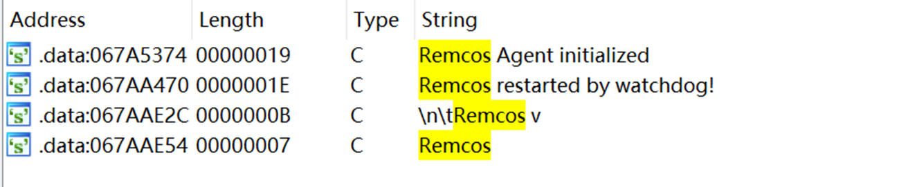 该shellcode为一段完整的RemcosRAT,其CC为45.146.254【.】153:443,Dump下来的shellcode中包含的有关Remcos的字符串如下:
