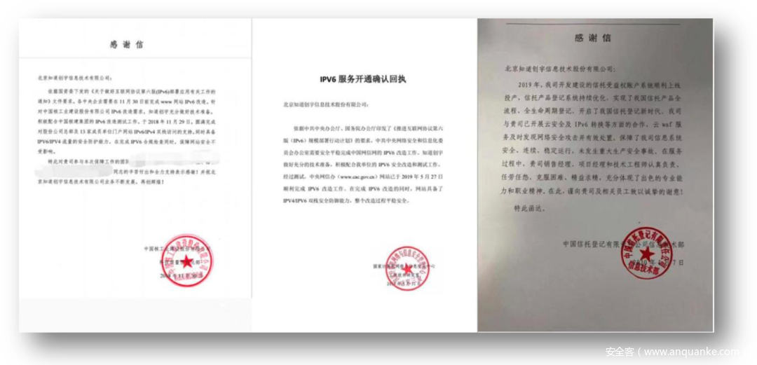目前知道创宇IPv6改造已经在政府单位、国企央企、金融、教育等行业进行了成功落地,依靠网络安全实战攻防技术的积累以及深厚的云安全能力积累,知道创宇帮助客户的业务系统完成了IPv6双栈安全改造,同时也保障了业务系统的安全稳定运行,受到了客户的广泛认可。