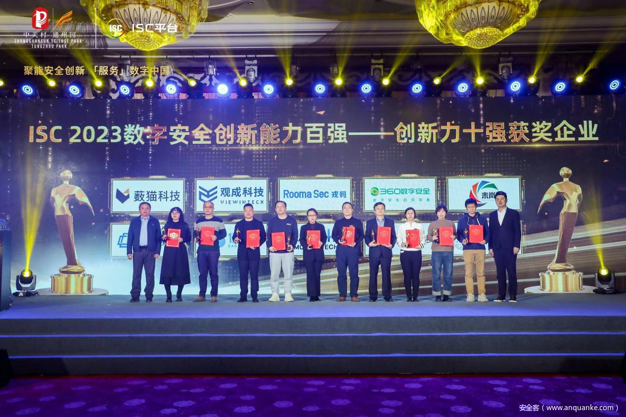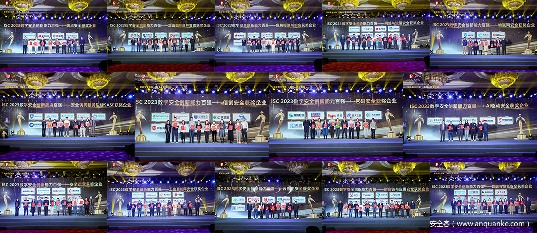 12月27日,数字安全技术创新论坛暨ISC 2023数字安全创新能力百强(简称“创新百强”)颁奖典礼在京圆满落幕。本届创新百强由北京市通州区人民政府指导,中关村科技园区通州园管理委员会、ISC平台主办,赛迪顾问、北京通州发展集团有限公司协办,并得到数说安全、数世咨询、密码资本、BP商业伙伴、安在、看雪、中国信息安全、安全419、安全客、嘶吼、联想、悬镜安全、天懋信息、四叶草、亿赛通、赛宁、卫达信息、天翼安全等服务机构、重点媒体,以及近50家厂商及投融资合作机构的大力支持。